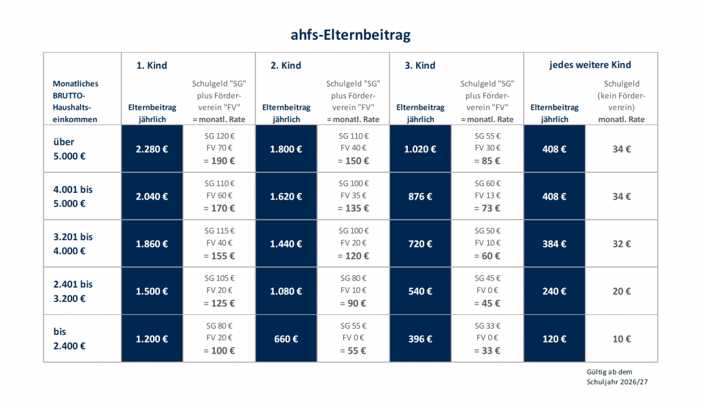 – Vertragsabschlussgebühr (100,- EUR): Diese Gebühr ist fällig, wenn ein neuer Schulvertrag abgeschlossen wird. Dies gilt auch beim Wechsel von der vierten Grundschulklasse einer ahfs in die fünfte Klassenstufe einer weiterführenden ahfs.